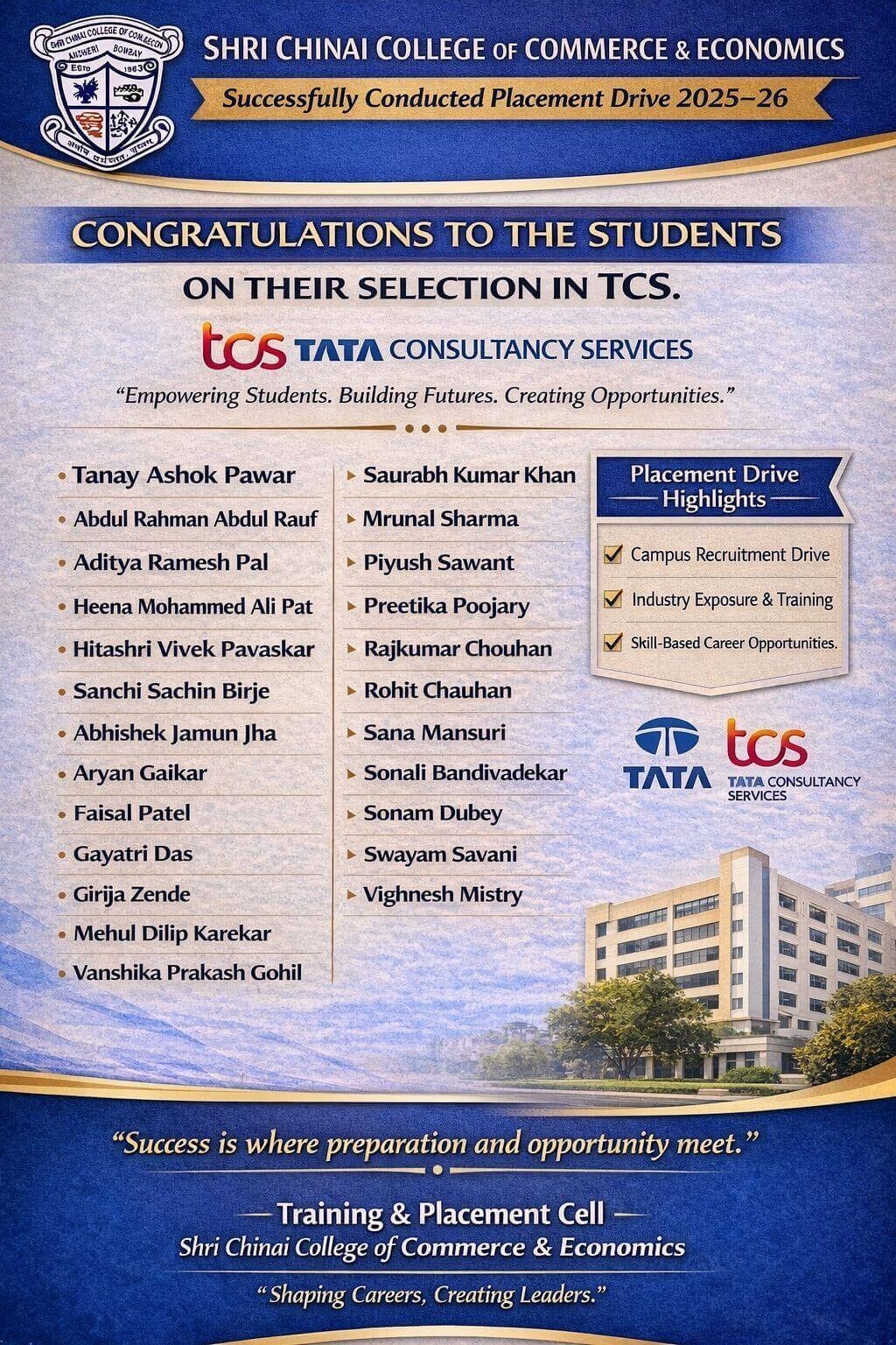 Mahatma Gandhi believed that education should be all round personality development and our Laxmi Charitable Trust’s Shri Chinai College of Commerce and Economics is leading to inculcate the same culture among the students who resides in and around Andheri with special objective of developing commercial knowledge and enriching the student in the field so that the students will contribute towards economic growth of the nation.