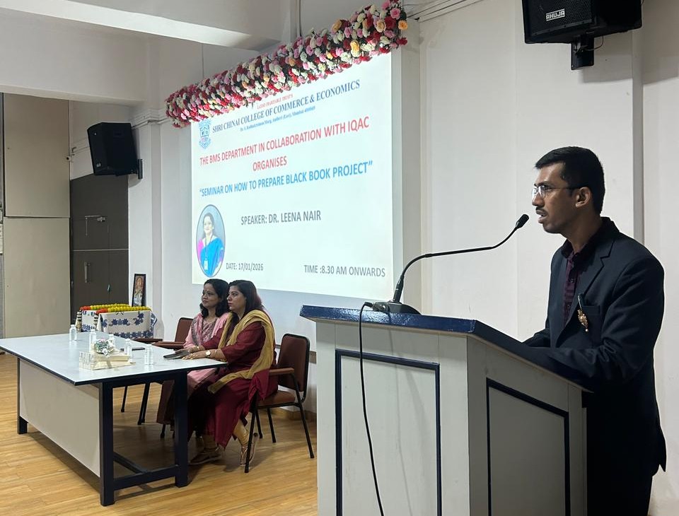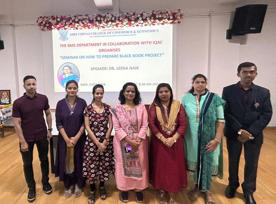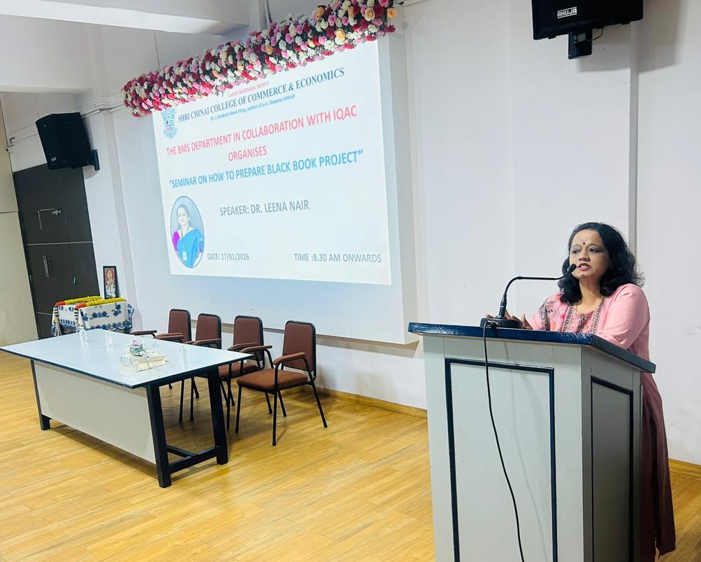 Shri Chinai College of Commerce and Economics, organized a seminar on “How to Prepare Black Book Project” on 17th January 2026 at 8:30 a.m. in the college auditorium for T.Y.B.A.F., T.Y.B.M.S., T.Y.B.F.M., and T.Y.B.B.I students. The session was conducted by Dr. Leena Nair, who guided students on topic selection, research methodology, data analysis, formatting, referencing, and viva preparation while emphasizing originality and adherence to university guidelines. A total of 154 students attended the seminar, which proved to be highly informative and beneficial.