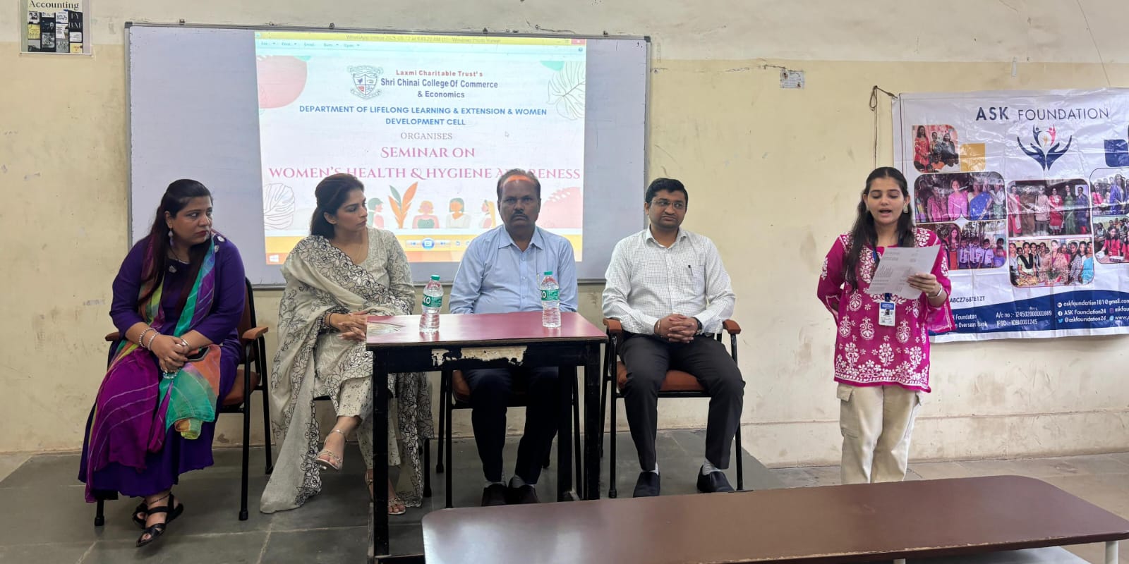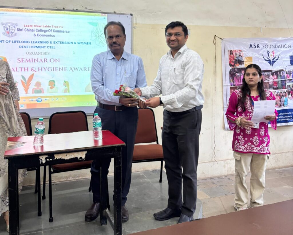 The Department of Lifelong Learning and Extension & Women Development Cell, in collaboration with the Internal Quality Assurance Cell (IQAC) of Shri Chinai College of Commerce & Economics, successfully organized a Seminar on Women’s Health & Hygiene Awareness on Friday, 12th September 2025 at 10:00 a.m. The resource person for the seminar was Mrs. Avani Agasti, Founder of ASK Foundation24.